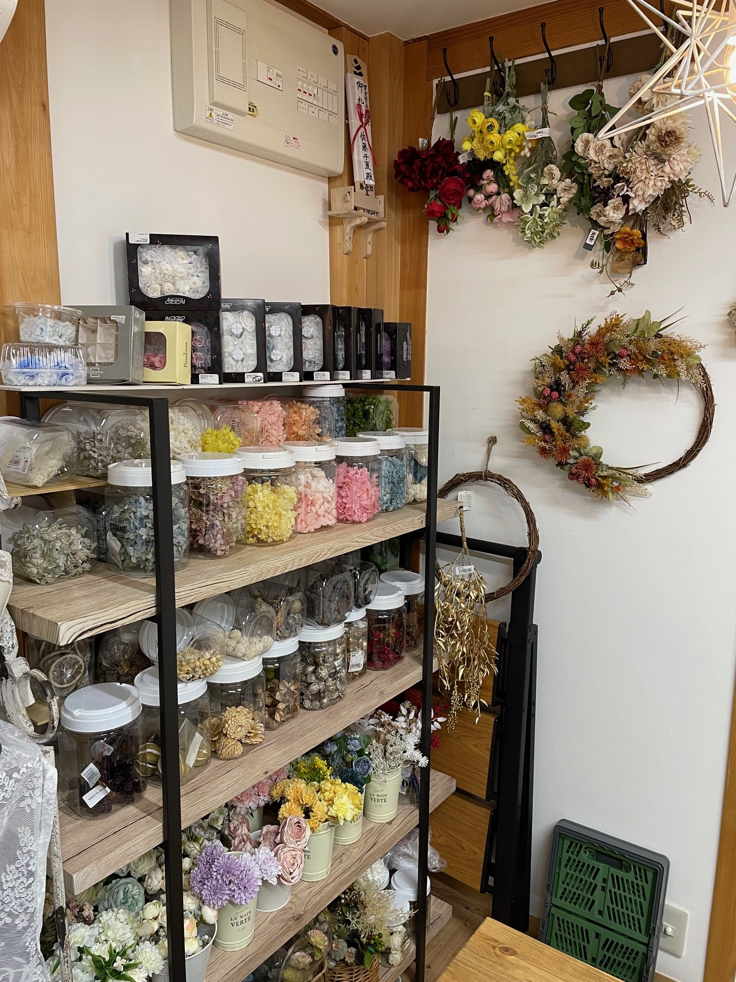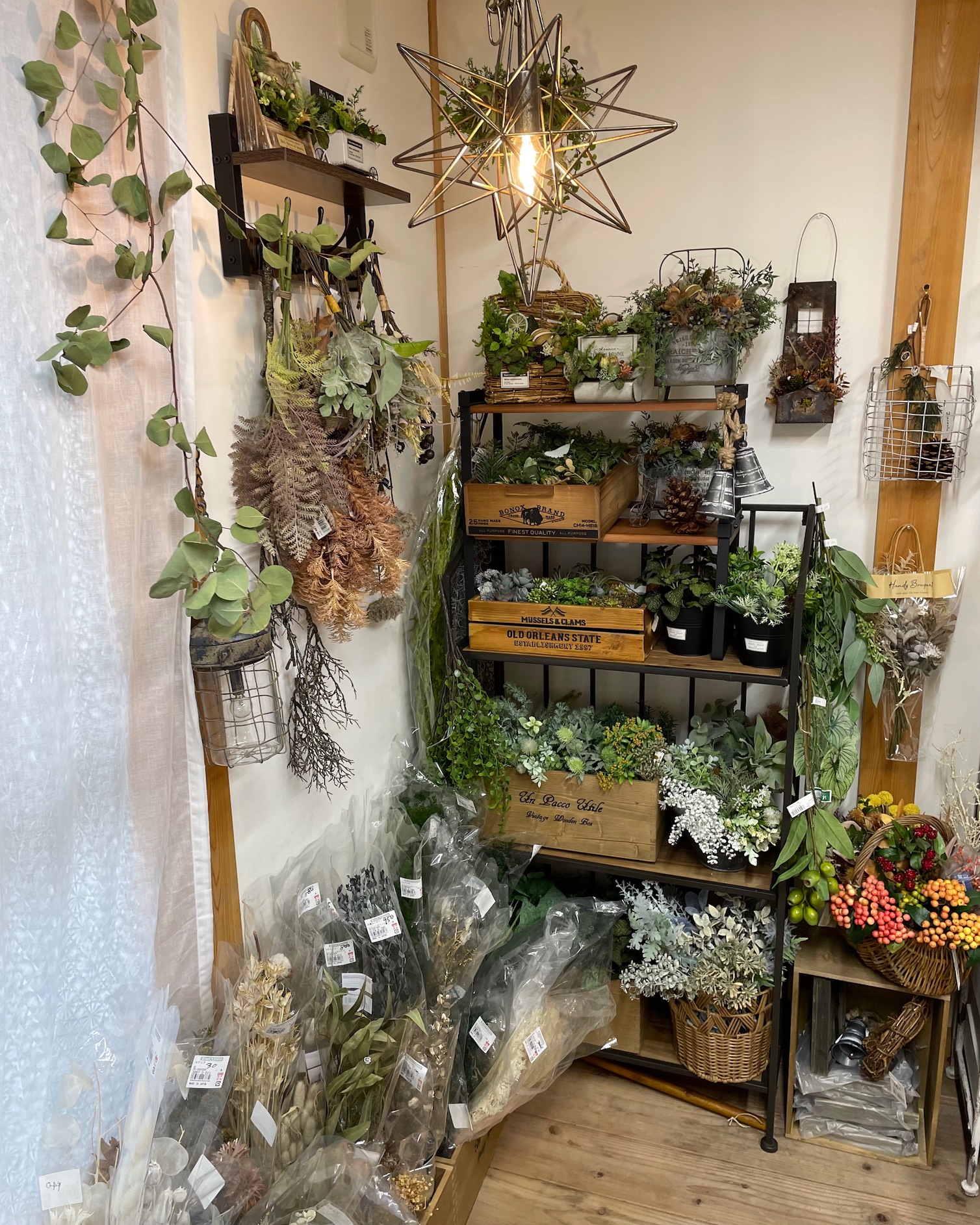 また、花材やモチーフの販売もされてますので、店内はドライフラワーや落ち着くグリーンの花材が種類多く並んでいます。